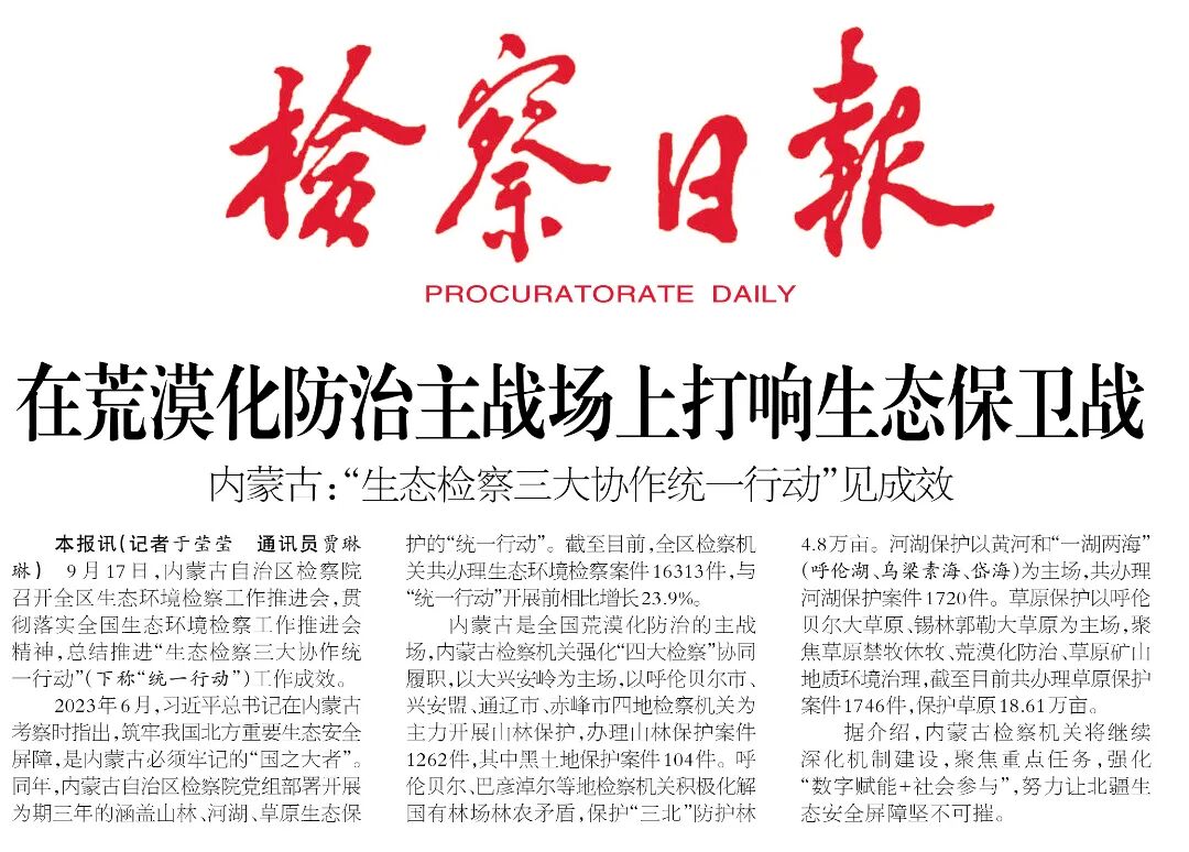 2023年6月,习近平总书记在内蒙古考察时指出,筑牢我国北方重要生态安全屏障,是内蒙古必须牢记的“国之大者”。同年,内蒙古自治区检察院党组部署开展为期三年的涵盖山林、河湖、草原生态保护的“统一行动”。截至目前,全区检察机关共办理生态环境检察案件16313件,与“统一行动”开展前相比增长23.9%。