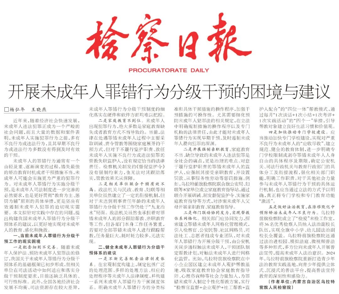五是做好法治教育,在潜移默化中预防矫治未成年人不良行为。乌拉特前旗检察院成立了“检爱”未检工作室,将36名优秀检察人员纳入法治副校长队伍,实现全旗中小学、幼儿园法治副校长全覆盖。乌拉特前旗检察院还通过法治进校园、模拟法庭、微视频普法等多种形式,多方位向未成年人开展普法宣传,提高未成年人法治意识。2024年,乌拉特前旗检察院重新打造青少年法治教育实践基地,向青少年提供立体式、沉浸式的普法平台,提高普法宣传教育的深刻性和感染力。